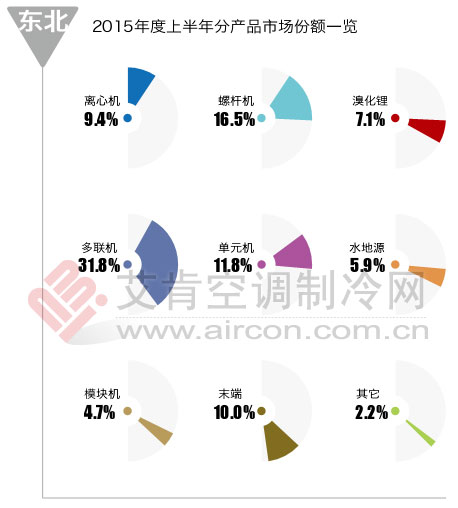 依靠大項(xiàng)目撐起整體銷量,中小項(xiàng)目零散的特點(diǎn)的東北市場(chǎng)。2015上半年大項(xiàng)目并不如人意,國(guó)家招標(biāo)項(xiàng)目的減少,使得離心機(jī)、螺桿機(jī)等水系統(tǒng)產(chǎn)品均出現(xiàn)不同程度的下滑。